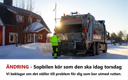 ÄNDRING - Sopbilen kör som den ska idag torsdag Vi beklagar om det ställer till problem för dig som bor utmed rutten.