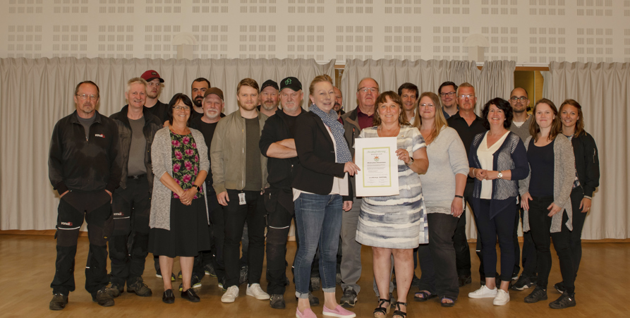 Förra veckan samlades VIBO/VIFABS nya styrelse för sitt första möte där de även träffade alla medarbetare. På bilden håller VD och ordförande Maria Kristoffersson upp avsiktsförklaringen Klimatinitiativet som innebär att VIBO/VIFAB ska minska utsläppen av växthusgaser.